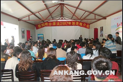 4月7日,天晴气朗、阳光亮丽,青山流翠、碧水泛绿,秦岭峡谷漂流2007年旅游推介会在宁陕县广货街镇举行。向来自西安的20余家旅行社和10余家媒体展示了宁陕秦岭峡谷漂流旅游的独特魅力。
