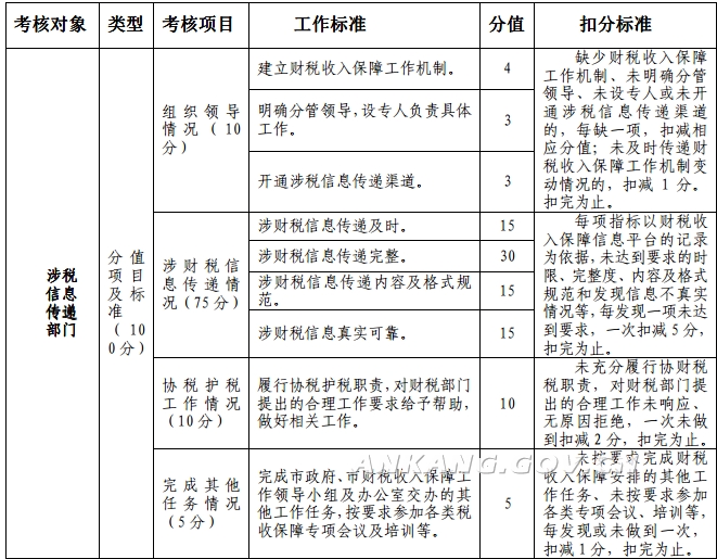 考核内容以《安康市财税收入保障办法》所规定的涉税信息为主,实行百分制考核(具体标准见附件 2),考核内容如下: