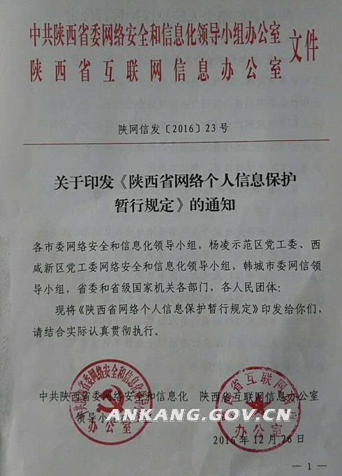 现将《中共陕西省委网络安全和信息化领导小组办公室 陕西省互联网信息办公室关于印发<陕西省网络个人信息保护暂行规定>的通知》(陕网信发〔2016〕23号)转发给你们,请结合实际认真贯彻执行。