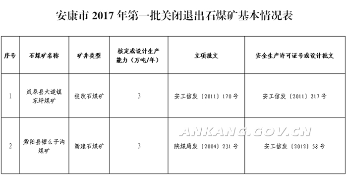 省煤管局: 安康市2017年第一批关闭退出2处石煤矿,分别是岚皋县大道镇东坪煤矿,私营性质,2011年9月26 日批准为技术改造石煤矿,技改设计生产能力为3万吨/年;紫阳县塘么子沟煤矿,私营性质,2004年9月15日批准为新建石矿,批准设计生产能力3万吨/年。现申请将该2处石煤矿列入2017年度煤矿关闭退出计划,请按照程序予以公告关闭。