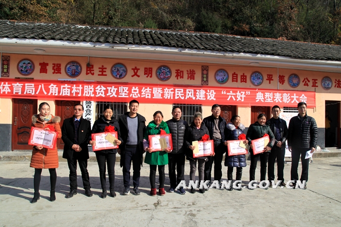 市体育局对八角庙村脱贫攻坚新民风建设“六好”典型进行了表彰。共通报表彰“脱贫致富好村民”“服务群众好干部”“互助友善好邻居”“孝老爱亲好媳妇”“家庭和睦好婆婆”“幸福美满好家庭”6个方面、19名(户)先进典型,并公开进行表彰奖励。陈功华等3名同志代表全体受表彰对象发言。