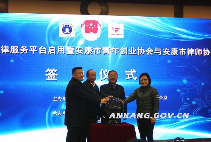 1月8日,我市举行公共法律服务平台“安康e法通”启用暨市青年创业协会与市律师协会合作签约仪式。市委副书记鲍永能,市委常委、政法委书记陈明,市政府副市长、市公安局局长杨尚伟,市政协副主席孟平出席活动。