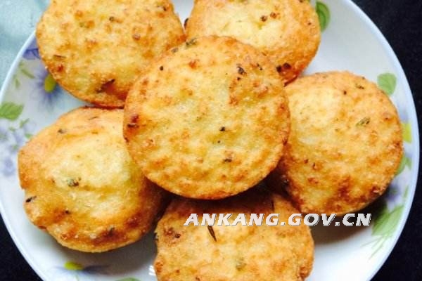 将面粉、黄豆粉、紫阳豆腐搅拌和匀油炸而成,吃时浇上淀粉醋蒜辣椒汁,口味酥脆麻辣,令人回味。