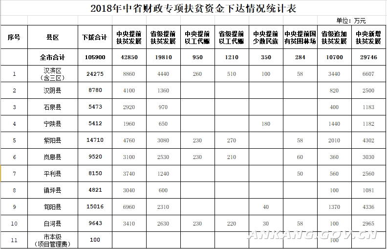 截止2018年5月底,中省共下达我市2018年度财政专项扶贫资金105900万元,其中中央资金74180,省级资金31720。具体为:扶贫发展资金103106万元,以工代赈资金2160万元,少数民族发展资金350万元,国有贫困林场扶贫资金284万元。以上资金预算及计划已全部下达到县区,具体情况见附件。