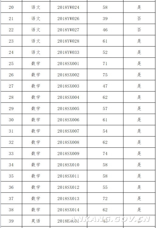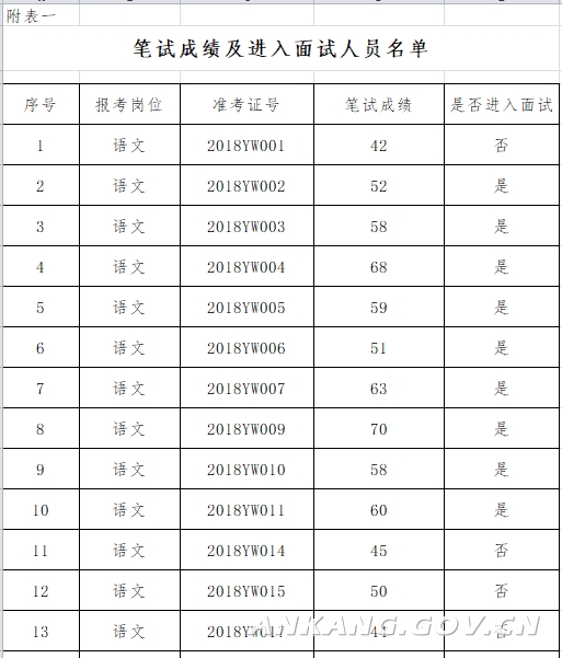 根据《安康职业技术学院附属小学公开选调教师公告》,2018年6月27日,安康职业技术学院会同市教育局组织实施了选调教师笔试工作。笔试应到考生63名,实到考生63名,笔试平均成绩53.42分、合格分数线32.05分(成绩保留小数点后两位,不进行四舍五入)。参加笔试的63名考生全部达到合格分数线。按达到合格分数线标准而报考岗位人数大于拟选调人数3倍及以上的按1:3比例确定参加面试人员名单,达不到3倍的岗位,达到合格分数线的全部进入面试阶段;笔试得分并列面试选调人数末位的,并列人员均进入面试。资格审查符合条件的省级教学能手直接进入面试。共有54人进入面试阶段。现将笔试成绩和进入面试人员予以公示(详见附件)。进入面试阶段的人员请于2018年7月1日早上8点准时在安康职业技术学院5号楼107室集中候考。