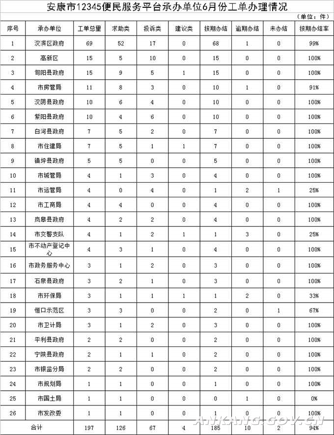 6月份,我市第十二届“中国安康汉江龙舟节”隆重举行,市12345便民服务热线来电量明显增加,共接听群众来电3150件,较上月增长23%(主要为旅游咨询服务)。话务员直接回复2953件,形成工单转派相关单位办理197件。其中,按期办结185件,逾期办结10件,未办结2件,按期办结率94%(详见附件)。197件工单中,求助类126件,占64%;投诉类67件,占34%;建议类4件,占2%。