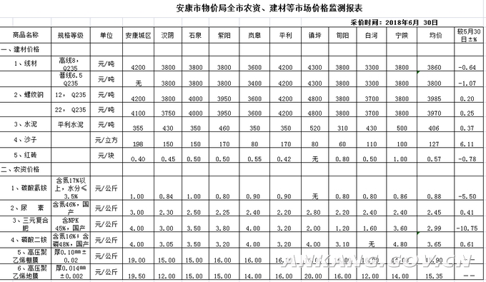 2018年6月全市农资、建材等市场价格监测报表(第六期)