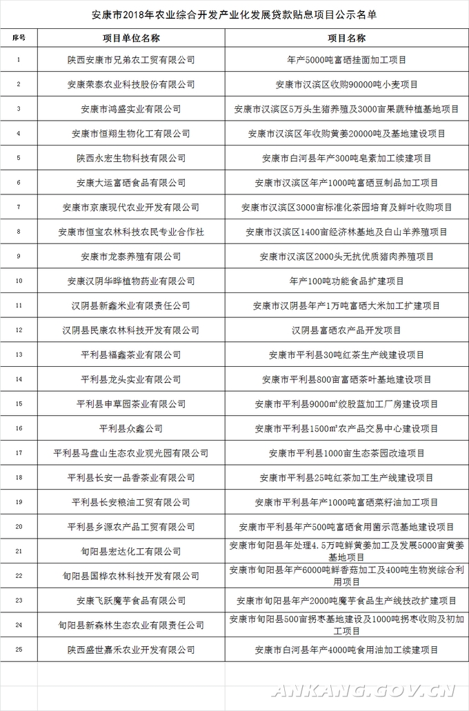 安康市2018年农业综合开发产业化发展财政贴息项目名单公示