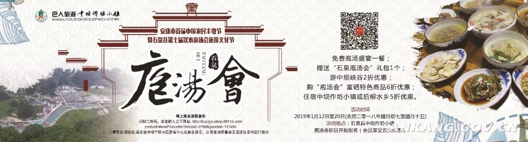 安康首届“中国农民丰收节”暨石泉县第七届汉水庖汤会旅游文化节将于2019年1月12日至20日在中坝作坊小镇举行,为期九天。