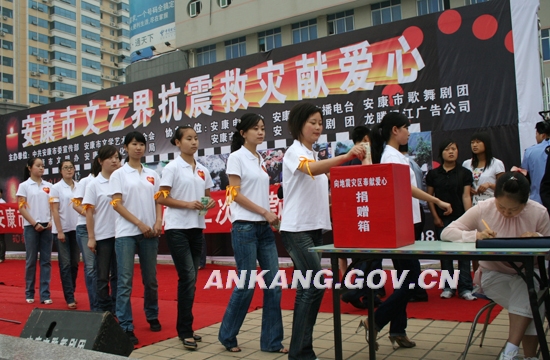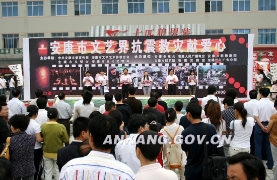 5月23日上午,由市委宣传部、市文联、市文明办、市文化局联合主办的“安康市文艺界抗震救灾献爱心”活动在白天鹅广场隆重举行。市委常委、市委宣传部长钟顺虎,市委常委、副市长王东华,市人大常委会副主任卢杰火、程必呈,市政协副主席李启良出席活动。