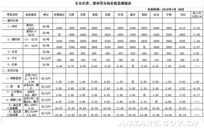 2019年1月全市农资、建材等市场价格监测报表(第一期)