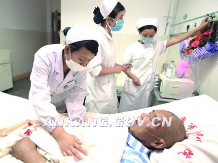 5月29日,安康市中心医院医护人员精心护理来安康治疗的四川绵竹地震伤员。(母家亮摄)