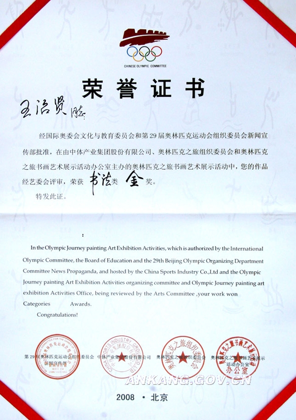 王治贤在工作之余,从事书法写作30余年,创作作品近千幅,其作品多次获奖,现任安康市书法协会会员,陕西省财政书画协会常务理事。此次,王治贤同志作品的获奖,充分展示了安康人支持奥运、宣传奥运、参与奥运的良好精神风貌。