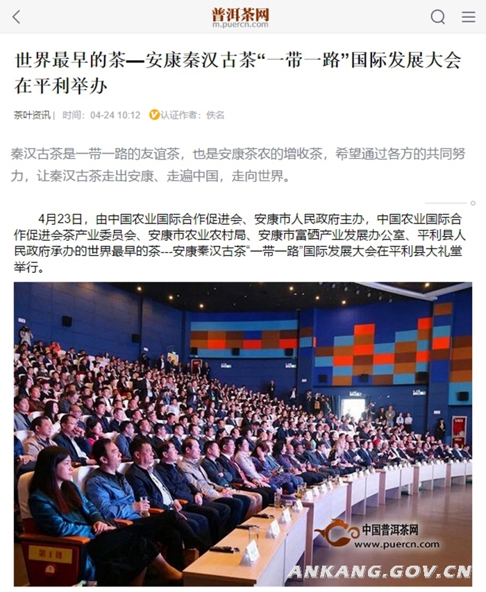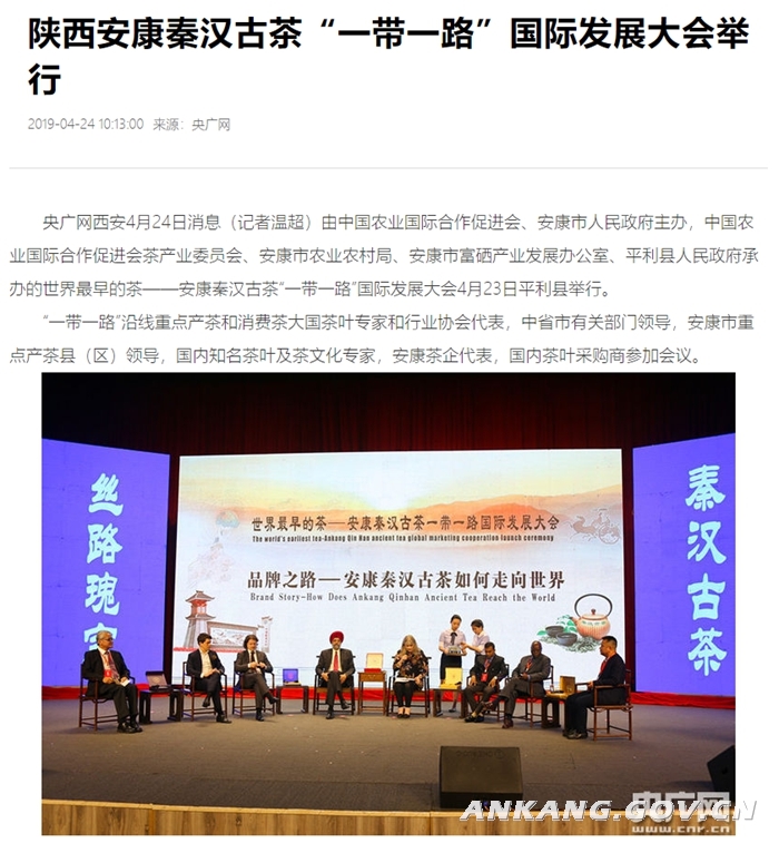 为提升安康富硒茶的国际知名度和市场影响力,倾力打造“世界上最早的茶——秦汉古茶”世界级招牌,努力使“秦汉古茶”成为丝绸之路经济带的“丝路瑰宝”,成为国家外事活动的“国礼茶”,加快推动秦汉古茶走出国门,搭建国际合作交流平台,造福世界人民健康。4月23日,由中国农业国际合作促进会、安康市人民政府主办的世界最早的茶——安康秦汉古茶“一带一路”国际发展大会在我市平利县召开,接着又借助第十一届中国国际茶业及茶艺博览会平台,4月27日在北京成功举办安康富硒茶(富硒农产品)“三年百市百店千点”华北地区送健康活动启动仪式暨世界最早的茶——安康秦汉古茶推介活动。