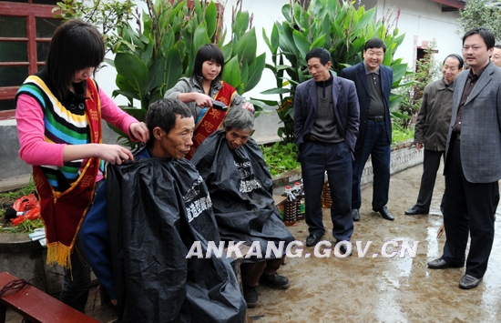 县医院的医疗志愿服务队,仔细地为老人们做医学常规检查,开写处方,并为患病的老人准备了必备的药品,老人们充分享受着志愿者提供的这项服务,喜悦的心情溢于言表;鑫鑫发艺的义务理发小分队为老人进行了理发、修胡须;40多名青年志愿者发扬不怕苦、不怕脏的精神,为老人们打扫房间、收拾床铺、洗衣洗头、剪指甲,志愿者们围坐在老人周围,给老人宣讲党的十七届三中全会精神,让老人们充分了解党在农村的好政策,享受改革开放带来的成果。志愿者用爱心与行动奏响了友爱奉献的和谐旋律,展现了“奉献、友爱、互助、进步”的时代新风,营造了敬老、爱老、助老的社会风尚。