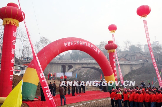 老君关旧桥平面线形差,纵坡大、坡长短,存在着严重的安全隐患,本次改造对原有道路局部进行改线,从旧桥南侧约40米处跨越河道修建新桥。新桥设计车速80公里/小时,桥梁全长206.78延米,桥宽12米,结构型式为10孔20米预应力砼箱梁,平面呈曲线形。路基全宽12米,双向行车道。通过公开招标,该工程由公路养护施工一类企业陕西省汉中公路工程机械化公司中标承建,控制投资652万元,计划工期一年。老君关大桥的建设将从根本上改善此段路的安全通行条件,也将以此为起点全面掀起2009年我市干线公路危桥加固改造的新高潮。