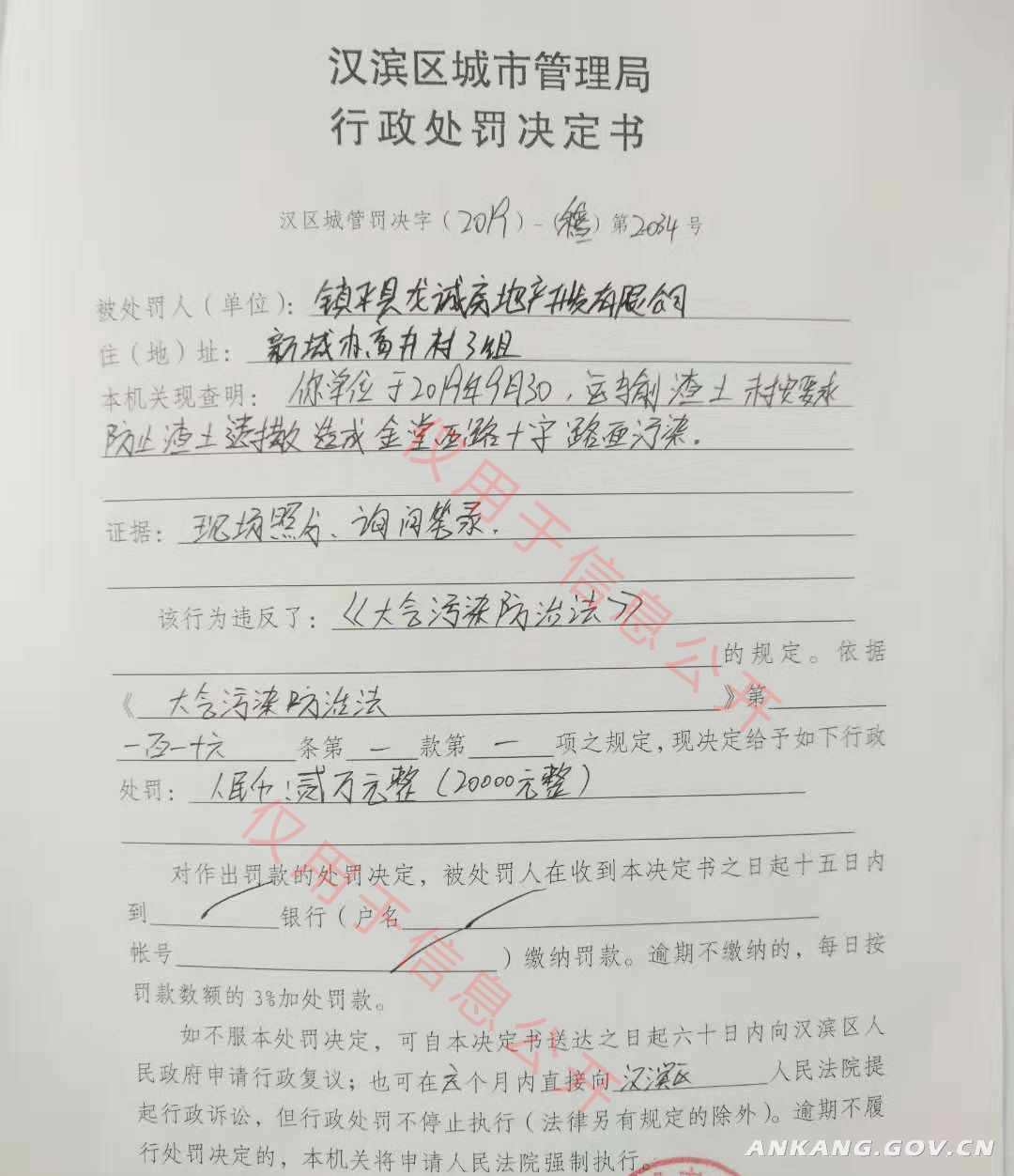 汉滨区城市管理局行政处罚公示(汉区城管罚决字2034号)