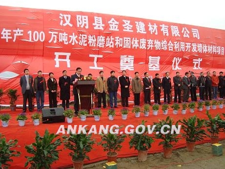 2月16日上午,年产100万吨水泥粉磨站和固体废弃物综合利用开发墙体材料项目建设奠基仪式在汉阴县新型建材工业园区举行。该项目的开工奠基打响了我县经济保增长,促发展的头一炮。市委常委、常务副市长邹明出席奠基仪式,副市长何少华宣布项目开工建设。市发改委、市中小企业局等市直部门主要领导参加奠基仪式。