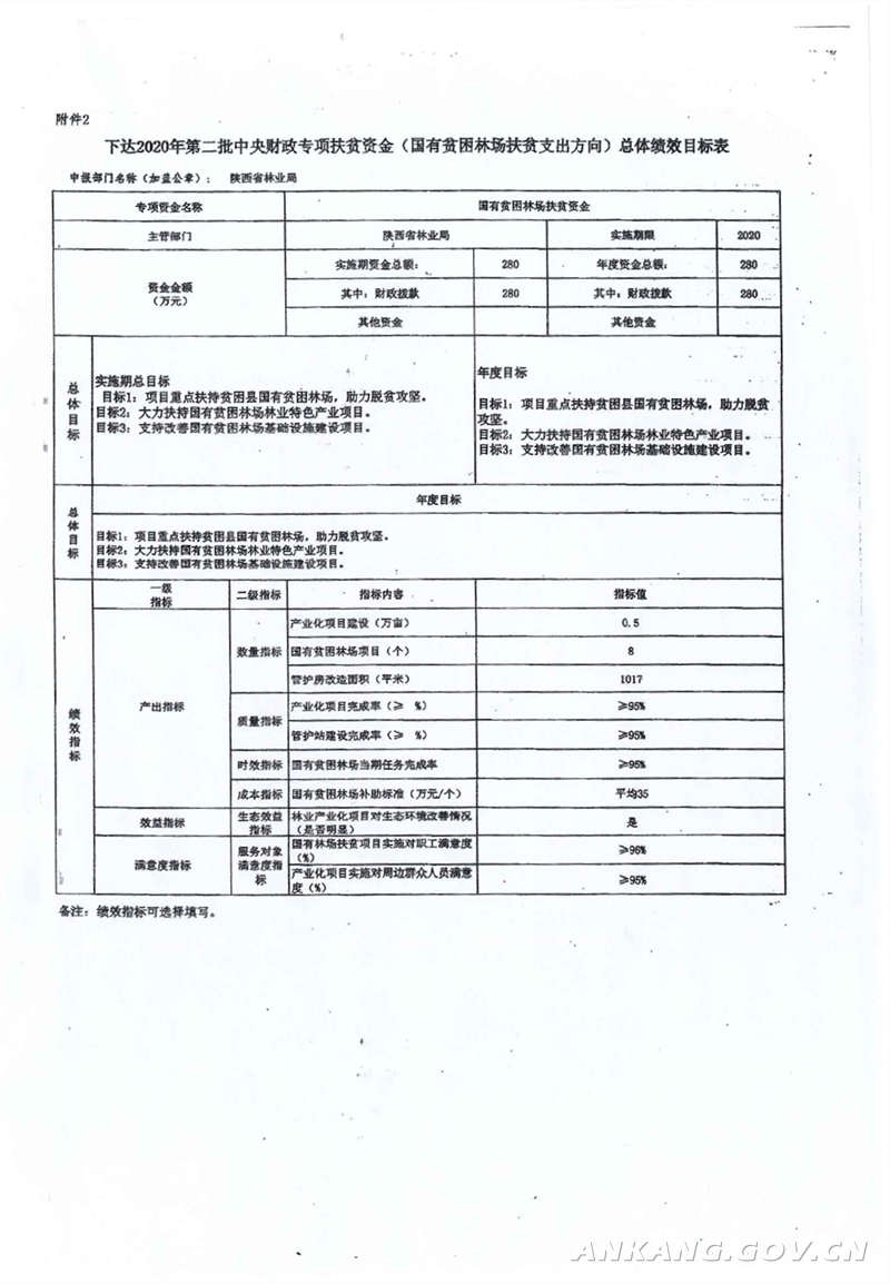 根据省财政厅《关于提前下达2020年第二批中央财政专项扶贫资金(国有贫困林场扶贫支出方向)预算的通知》(陕财办资环〔2020〕21号)以及省林业局、省财政厅《关于下达2020年第二批国有贫困林场扶贫资金项目计划的通知》(陕林财发〔2020〕74号),经商市林业局,现下达你县2020年第二批中央财政专项扶贫资金(国有贫困林场扶贫方向) 万元,列2020年政府收支分类科目“2130599其他扶贫支出”科目,支出经济分类科目列“51301上下级政府间转移性支出”。