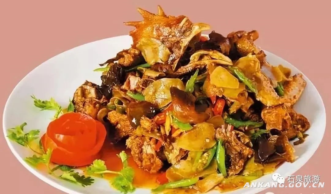 农家辣子鸡在石泉已有百年历史,因其选料精殊挑剔、制作较为复杂,味道香辣爽口而闻名四方。鲜嫩的农家土鸡加上大量辣椒、特制香料爆炒可谓鲜香扑鼻。盛在盘中,看在眼里,辣在嘴上,馋在心间。有食客赞曰:“外焦里嫩麻辣鸡,色泽金黄味道新。”
