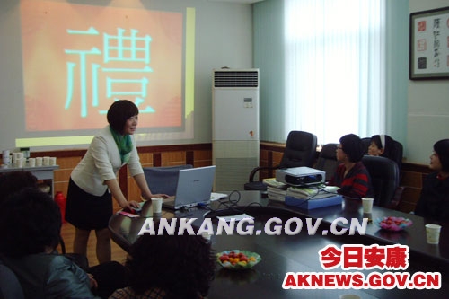 个人形象及礼仪是公务员素质的外在体现,也是反映机关形象的重要窗口。为整体提升机关女公务员的形象,规范公务礼仪,2009年3月20日下午,市委机关妇委会特别邀请了安康学院中文系副教授李霞为机关全体女同志进行一场形象礼仪方面的专题讲座。市妇联主席刘珺出席了本次活动。