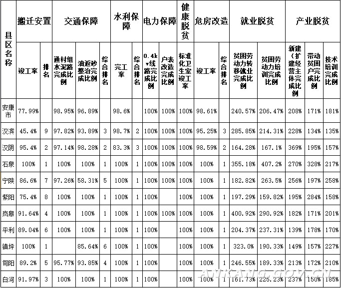 1.通报完成进度比例中的任务基数以“安脱指发【2018】14号”文件为依据,其中没有深度贫困村的县不涉及通组路任务,时间截止8月底;2.电力保障中紫阳、平利、镇坪、旬阳、白河5县无户表改造任务;3.产业脱贫、就业脱贫、健康脱贫、电力保障县区均已完成或超额完成年度计划任务不再进行排名。