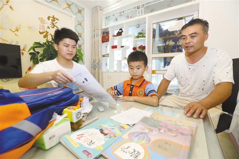 7月7日,在石泉县池河镇移民搬迁安置示范小区居民刘文波家,大儿子刘明登(左一)正帮弟弟刘明安辅导作业。陕西日报记者 肖晓良摄