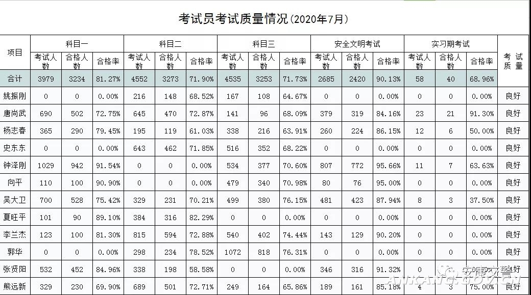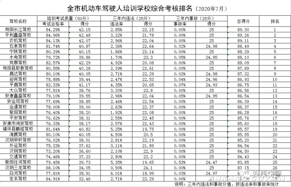 根据《机动车驾驶证申领和使用规定》(公安部第139号令)和公安部交管局《道路交通事故预防“减量控大”工作综合情况通报制度》,安康市公安局交警支队车辆管理所通过公安交通管理综合应用平台业务数据库和机动车驾驶人考试培训监管系统数据统计,对2020年7月份(6月22日至7月22日)全市机动车驾人考试情况、各机动车驾驶人培训学校考试合格率、三年内驾龄驾驶人交通违法率和交通肇事率等进行了统计排名。现将有关情况通报如下: