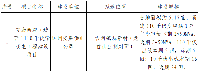 按照《城乡规划法》、《建设项目选址意见书管理办法》要求,以及《陕西省人民政府关于取消、下放或者委托一批行政审批事项的决定》(省政府令第214号),安康市住房和城乡建设局受理了国网安康供电公司关于安康西津(城西)110千伏输变电工程建设项目选址申请,该项目已于2020年9月17日邀请专家及相关单位现场踏勘,同时对该项目选址论证报告进行了评审,会议原则通过选址论证报告。该项目选址符合城乡规划要求,拟核发建设项目选址意见书。按照规划选址业务划转工作要求,此项业务现由安康市自然资源局承接,现将有关情况予以公示: