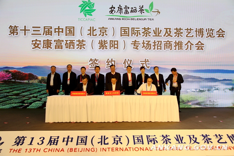 会上,紫阳县主要领导、平利县茶企代表等现场推介了安康富硒茶;中国茶叶股份有限公司、中国建设银行股份有限公司、紫阳县人民政府签订三方投资建立中茶紫阳富硒茶庄园项目备忘录;会上会下累计签订产业项目和茶叶购销意向协议2.15亿元。据了解,本次茶博会我市以“安康富硒茶 常饮常安康”为主题,组织全市20家茶企集中展示展销50余种茶业产品。茶博会期间,还将开展安康富硒茶“三年百市百店千点”华北地区送健康招商推介活动,参加第六届亚太茶茗大奖等系列活动,集中宣传安康富硒茶。