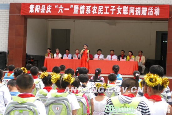 紫阳是陕南的劳务输出大县,常年有8万余人在外务工,农民工子女的教育问题也越来越突出。关爱农民工子女是一项长期性的工作。近年来,紫阳团县委积极争取社会各界的大力支持,为农民工及农民工子女提供服务和帮助。活动中,李大明一行为365名农民工子女现场捐赠了价值11万元的爱心书包和爱心文具。孩子们手捧着“六一”儿童节的礼物兴奋不已,幸福的笑脸在红领巾的映称下显得格外灿烂。农民工子女代表叶丽在发言中激动地说:“感谢各位领导、各位叔叔阿姨对我们农民工子女的关爱!我们在党和政府的关怀下,一定会更加发奋学习,长大后回报家乡、回报社会,成为祖国的栋梁之才!”。活动结束后,洞河镇中心学校的师生们为大家奉献了一台精彩的文艺演出。参加活动的领导不仅兴致勃勃地观看了演出,还同孩子们一起参加了游戏活动。现场气氛温馨感人,热闹非凡,欢声笑语久久在校园中回荡。