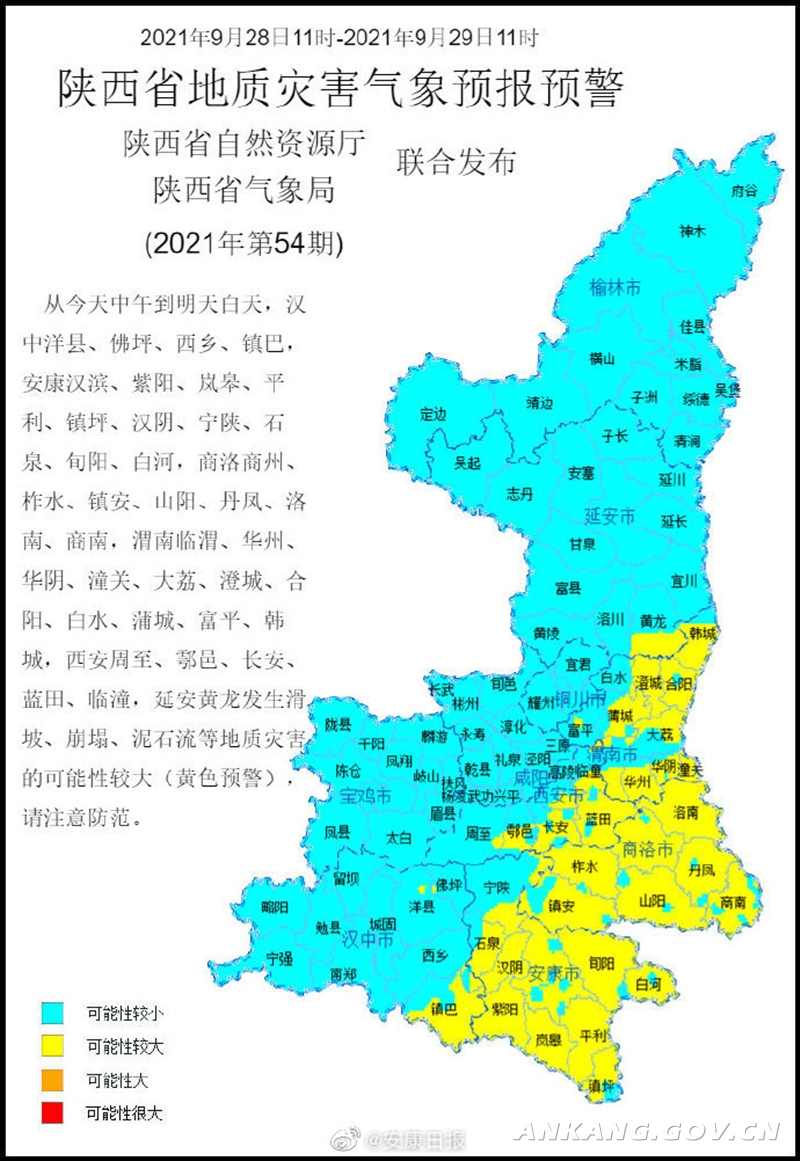 陕西省自然资源厅与陕西省气象局联合发布地质灾害气象预报预警:预计9月28日11时至9月29日11时,安康汉滨、紫阳、岚皋、平利、镇坪、汉阴、宁陕、石泉、旬阳、白河发生滑坡、崩塌、泥石流等地质灾害的可能性较大(黄色预警),注意防范。