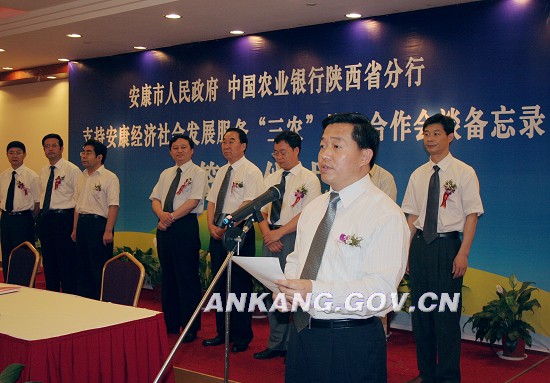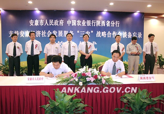 6月30日上午,安康市人民政府与中国农业银行陕西分行在晶海商务酒店隆重举行了安康经济社会发展服务“三农”战略合作备忘录签字仪式。按照双方签署的合作协议,农行陕西分行将在未来5年内为我市投放贷款不少于100亿元人民币的意向性信用额度。