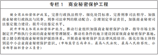 健全知识产权法律法规。开展知识产权基础性法律研究。统筹推进专利法、商标法、著作权法、反垄断法、科学技术进步法、电子商务法等相关法律法规的修改完善。加强地理标志、商业秘密等领域立法,出台商业秘密保护规定。完善集成电路布图设计法规。推进修订植物新品种保护条例。制定中医药传统知识保护条例。完善与国防建设相衔接的知识产权法律制度。全面建立并实施知识产权侵权惩罚性赔偿制度,加大损害赔偿力度。研究建立健全符合知识产权审判规律的特别程序法律制度。适应科技进步和经济社会发展需要,依法及时推动知识产权法律法规立改废释。(中央宣传部、最高人民法院、最高人民检察院、科技部、工业和信息化部、司法部、农业农村部、商务部、国家卫生健康委、市场监管总局、国家国防科工局、国家林草局、国家中医药局、国家知识产权局、中央军委装备发展部等按职责分工负责)