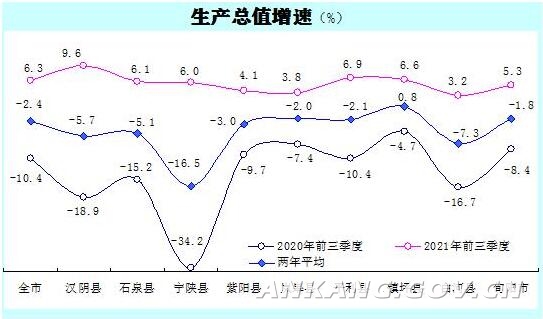 (一)县域经济稳步恢复。前三季度,全市县域生产总值594.21亿元,同比增长5.8%,两年平均下降3.9%,9县(市)中,有3个县GDP增速高于全市平均水平(6.3%),增速较快的汉阴县和平利县,分别增长9.6%和6.9%。