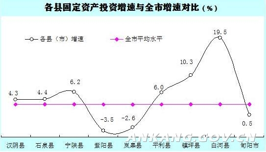(五)固定资产投资恢复态势良好。前三季度,全市固定资产投资同比增长3.1%,全市9县(市)中有6县增速高于全市平均水平,增长最快的白河县,增速达19.5%,其次是镇坪县和宁陕县,分别增长10.3%和6.2%;其中白河县较上半年加快4.1个百分点。