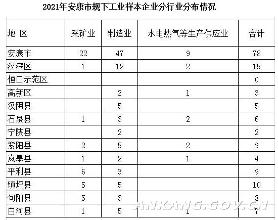 截止2021年4季度末,安康市共抽选规下工业样本企业78户,分布在45个样本村(居)中,具体数量分布及行业结构见下表: