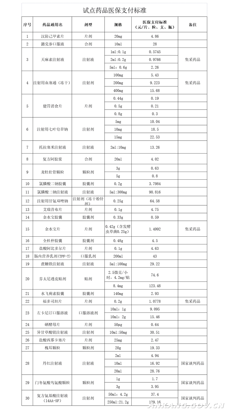 根据国家医保局要求,我局确定了30种试点药品的医保支付标准,其中:国家谈判药品按照国家谈判价格确定、国家和省级集采中选药品按中选价确定,中选药品其他规格按差比价确定,非国家谈判药品或非国家和省级集采药品按照量价加权方法确定代表品规格,其他规格按差比价确定,现予公示,请于2022年1月30日前通过电子邮件、电话、信函等形式反馈意见或建议。