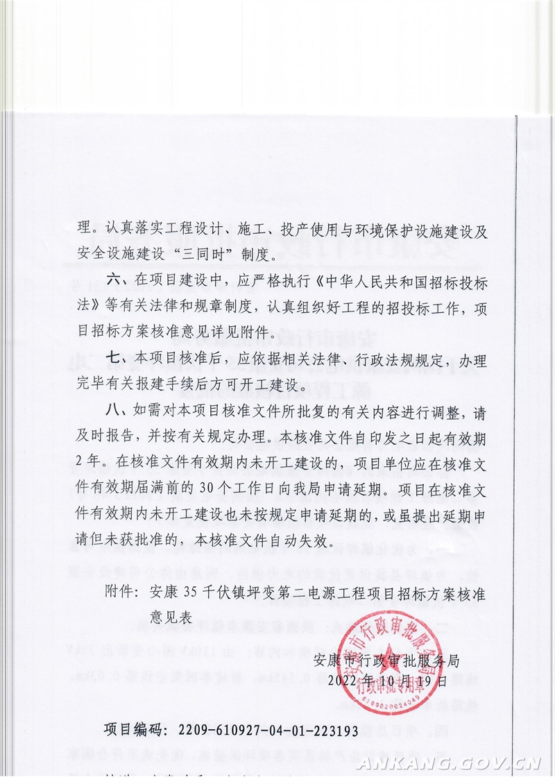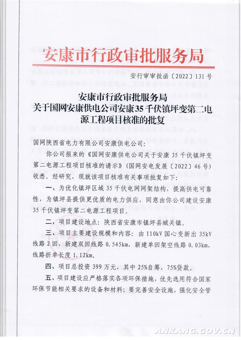 安康市行政审批服务局关于国网安康供电公司安康35千伏镇坪变第二电源工程项目核准的批复
