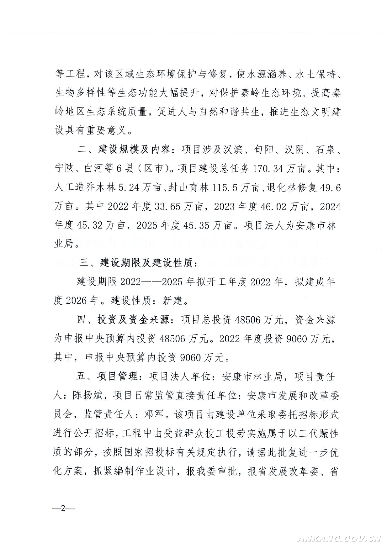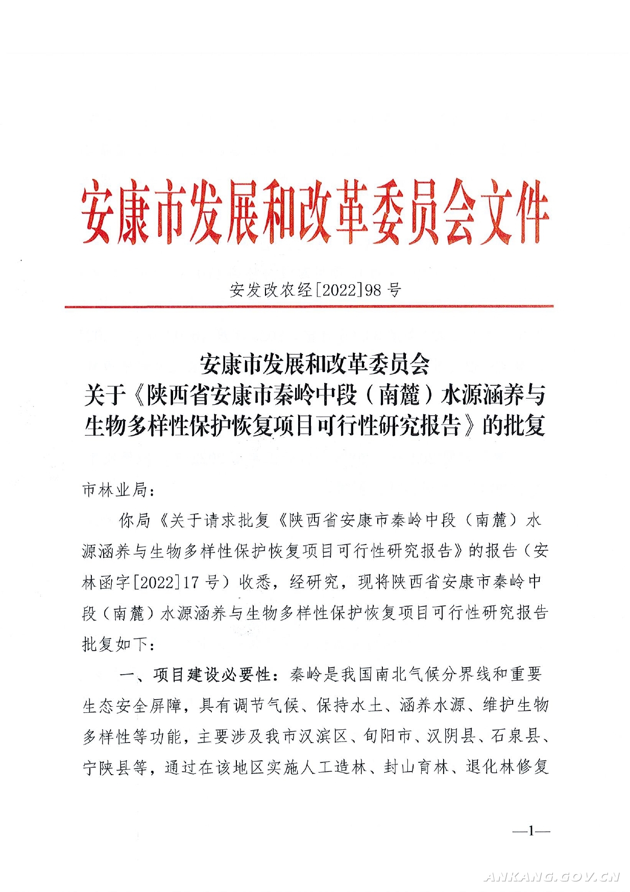 安康市发展和改革委员会关于《陕西省安康市秦岭中段(南麓)水源涵养与生物多样性保护恢复项目可行性研究报告》的批复