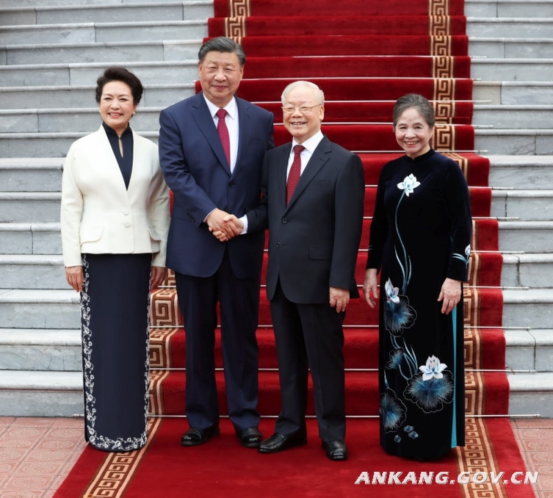 当晚,越共中央总书记阮富仲夫妇、越南国家主席武文赏夫妇共同为习近平和彭丽媛举行盛大欢迎宴会。越共中央政治局委员、书记处书记等高层领导人全部陪同出席。