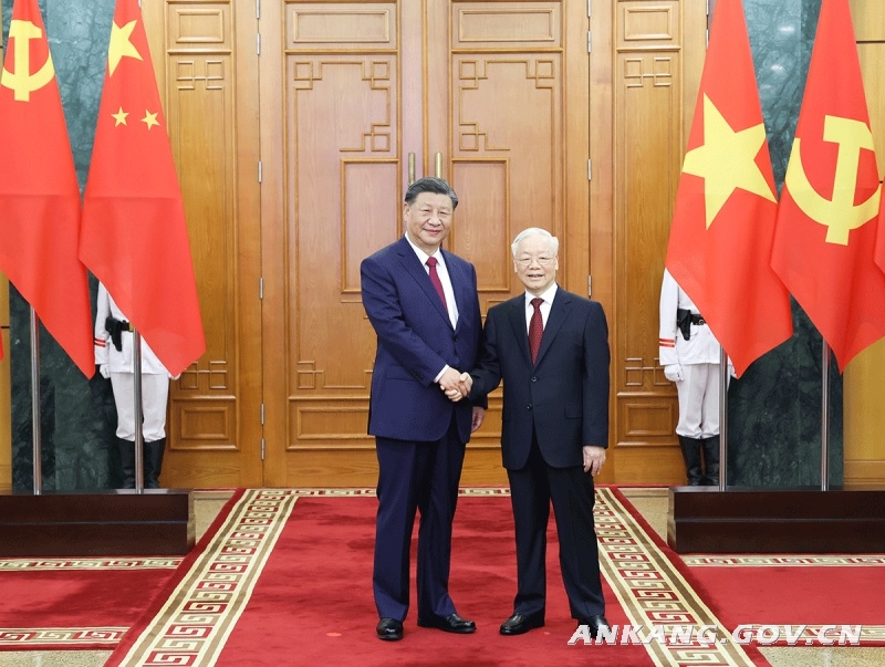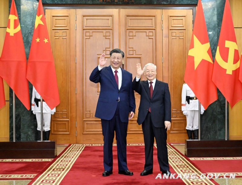 新华社河内12月12日电(记者倪四义 汪金福 陶军)当地时间12月12日下午,刚刚抵达河内的中共中央总书记、国家主席习近平在越共中央驻地同越共中央总书记阮富仲举行会谈。双方宣布中越两党两国关系新定位,在深化中越全面战略合作伙伴关系基础上,携手构建具有战略意义的中越命运共同体。