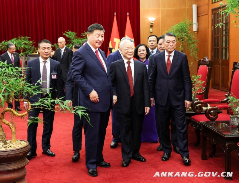 当地时间12月12日下午,刚刚抵达河内的中共中央总书记、国家主席习近平在越共中央驻地同越共中央总书记阮富仲举行会谈。新华社记者 庞兴雷 摄