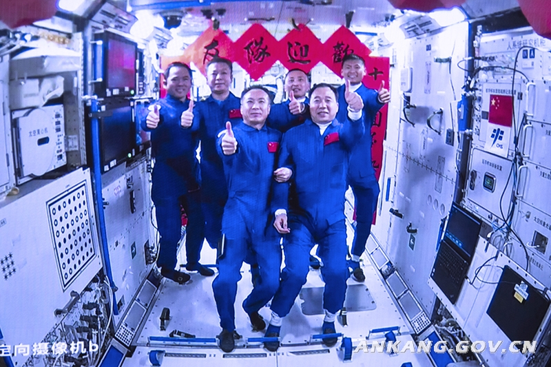 2023年5月30日在北京航天飞行控制中心拍摄的神舟十五号航天员乘组与神舟十六号航天员乘组拍下“全家福”的画面。新华社发(韩启扬 摄)