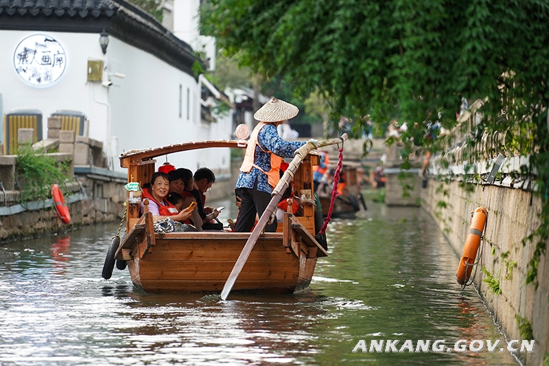 游客乘船在苏州平江历史文化街区休闲游玩(2023年7月3日摄)。新华社记者 李博 摄