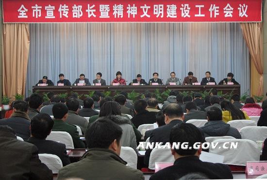会议总结回顾2009年我市宣传思想文化工作。过去的一年,全市宣传思想战线认真贯彻中省和市委的决策部署,着力推动突破发展保增长、把握正确导向促和谐、做靓文化品牌树形象,在服务大局中追求卓越,在创新发展中彰显特色,齐心协力,创新发展,硕果累累。为突破发展树立了示范样板,注入了精神动力,为“保增长、保稳定、保民生”提供了强大的思想文化保证。会议提出,全市2010年宣传思想工作的总体要求是:全面深入学习贯彻党的十七大、全省宣传部长会议和市委二届七次全会精神、坚持以邓小平理论和“三个代表”重要思想为指导,深入贯彻落实科学发展观,按照高举旗帜、围绕大局、服务人民、改革创新的总要求,牢牢把握正确的导向,为安康突破发展铸魂聚力;突出抓好经济宣传,为安康突破发展塑形增彩;强力推进文化快速发展,为安康突破发展开创新业;解放思想、真抓实干、不断提升战斗力、创造生产力,为推动安康突破发展、富裕安康人民提供强有力的思想保证、舆论支持、精神动力和文化条件。