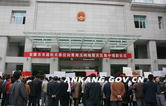 4月22日上午,安康市市级机关单位向青海玉树灾区集中捐款仪式在市政府行政中心大楼前举行。刘建明、方玮峰、邹明、崔光华、徐启方、钟顺虎、鲍永能、何少华等市委、市人大、市政府、市政协在家领导出席捐款仪式。