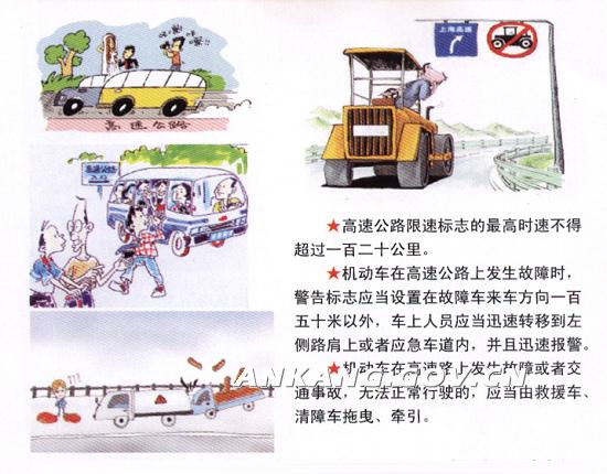 七、高速公路上不能随意停车,确因车辆故障需要临时停车检修时,必须驶离行车道,停在紧急停车带或右侧路肩上,并开启危险警报闪光灯、在行驶方向的后方100米处设置故障车警告标志,夜间还须同时开启示宽灯和尾灯。
