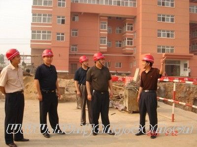 在山西省厚德建筑劳务有限公司旬阳籍老板潘厚德(右一)介绍公司承建工程建设情况