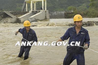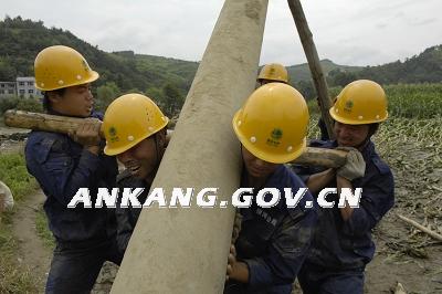 担负着乡村供电任务的张滩镇线县河支线62﹟至65﹟电杆也被拦腰斩断、连根拔起,安康供电局抗洪抢险突击队这支训练有素的队伍,在灾害发生次日,洪水并未完全退去便开展抢修工作,他们的最大心愿就是迅速恢复供电。跨江线路给抢修工作带来了巨大难度,抢修突击队员们手拉手将一根根导线从喘急浑浊的河水中拉到对岸,900多公斤的电杆需要十几个人最少得半天时间抬才能到位。有着光荣传统的安电铁军在灾难面前不仅没有低头,条件艰苦和抢险难度的巨大激发了安电人抢险的昂扬斗志,抢险队员们冒暴雨,战洪魔,加班加点、继日奋战,克服天气不断变化和作业环境恶劣带来的重重困难,这支训练有素的队伍,促使电力职工艰苦鏖战、舍生忘死的不竭动力,不光是他们肩上责任所系,还有他们对灾区人民的深情厚谊。